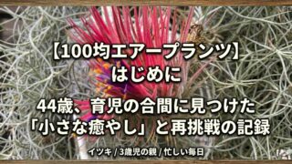 初めての方へ 【100均エアープランツ】44歳、育児の合間に見つけた「小さな癒やし」と再挑戦の記録 44歳、3歳児を育てる親が綴る「100均エアープランツ」の癒やしブログ。忙しい育児のスキマ時間で無理なく楽しめる、100円ショップの植物を活用した園芸の魅力をお届けします。枯らしてしまった失敗談から再挑戦する、等身大の記録です。 2025.09.06 初めての方へ